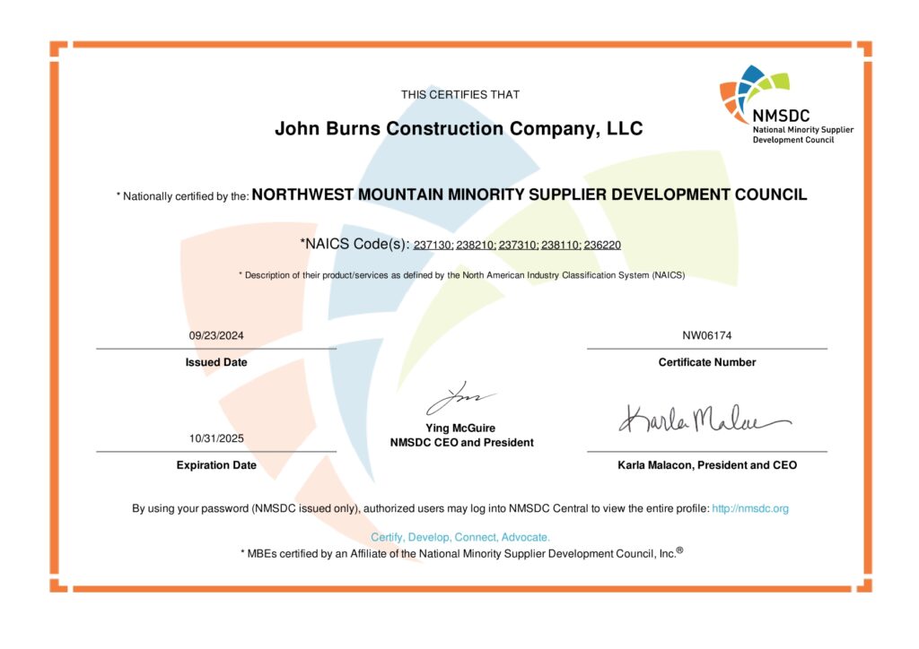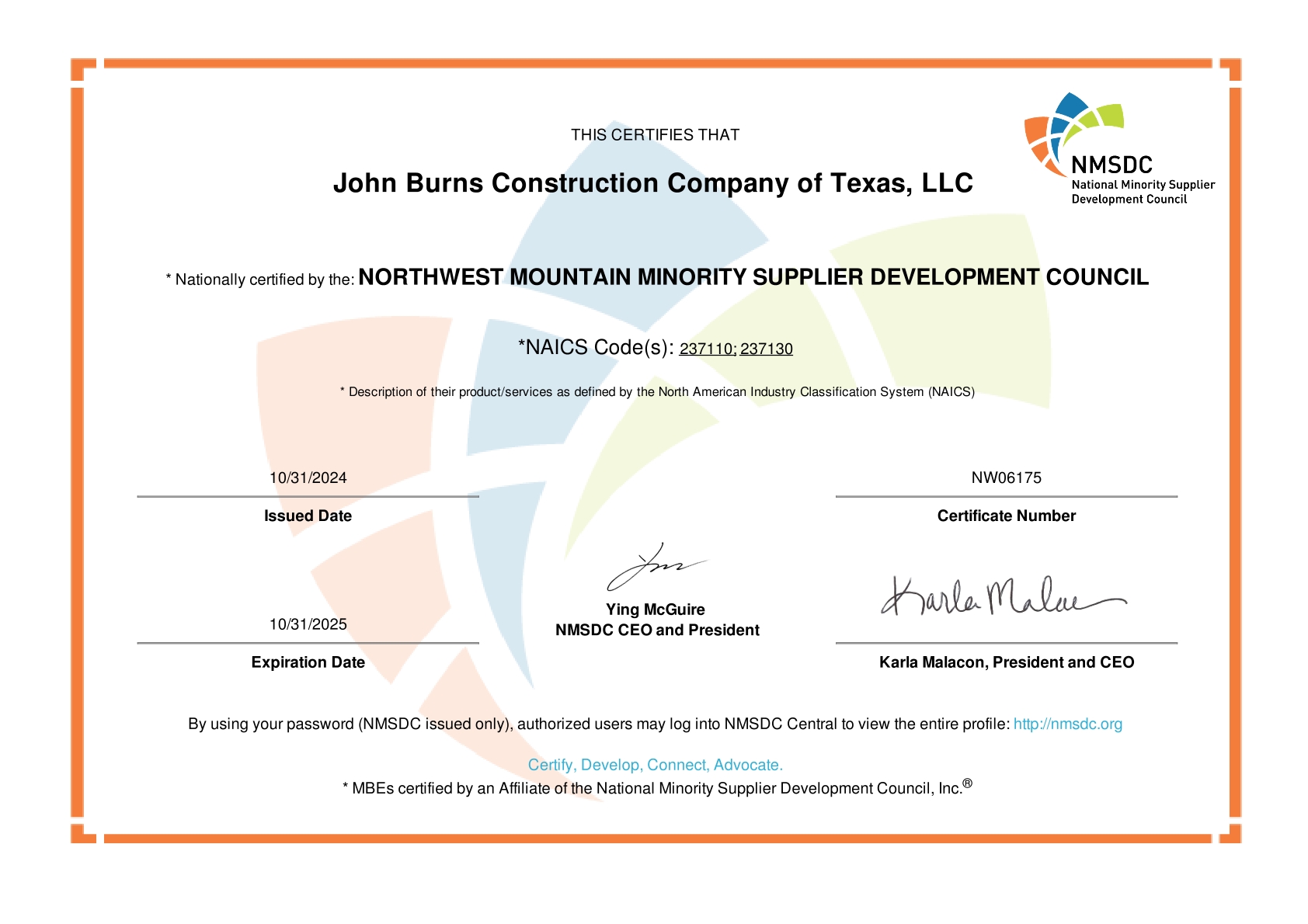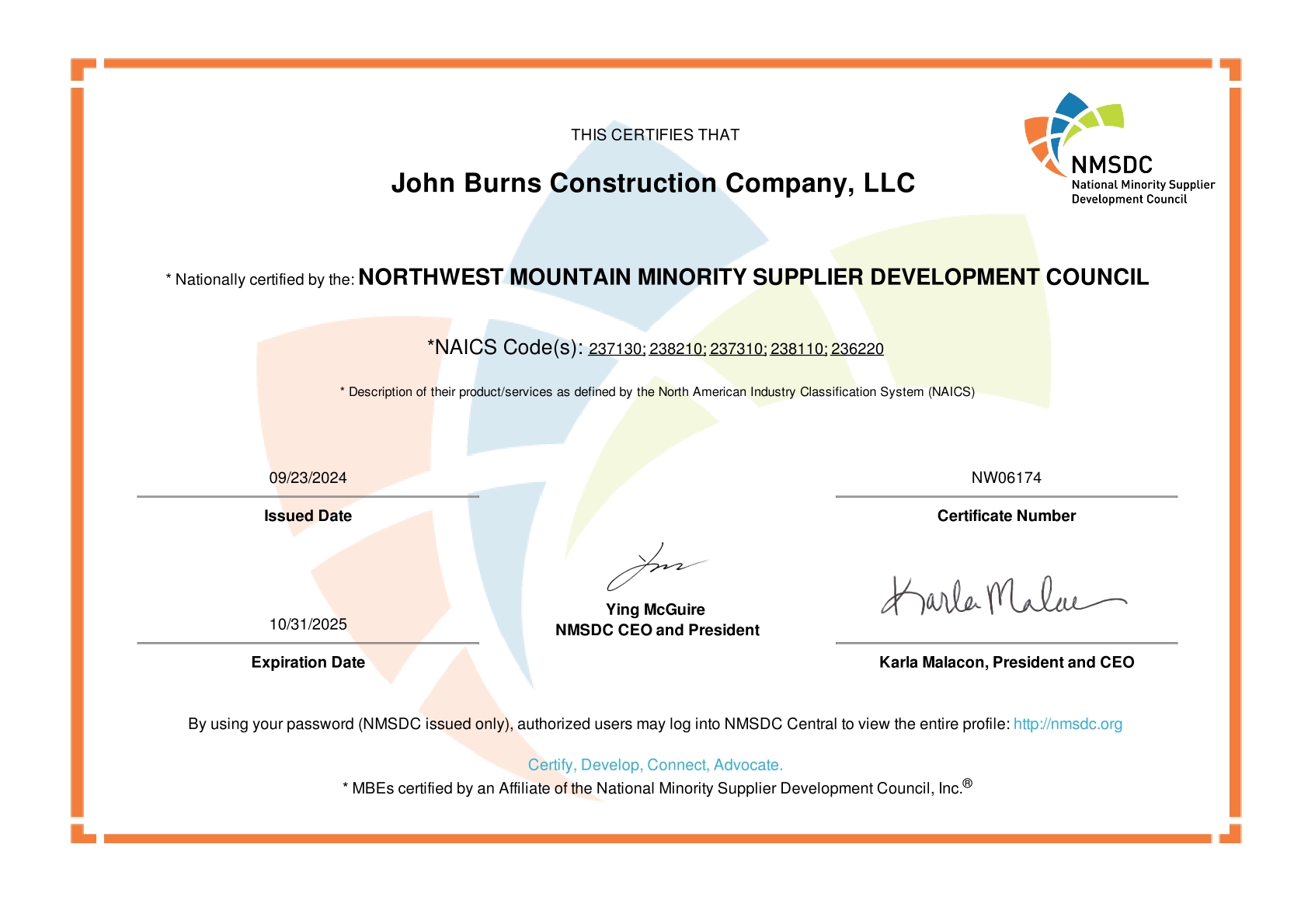 As a certified Minority Business Enterprise (MBE) through the National Minority Supplier Development Council (NMSDC), we can help you achieve your supplier diversity goals while strengthening project performance.