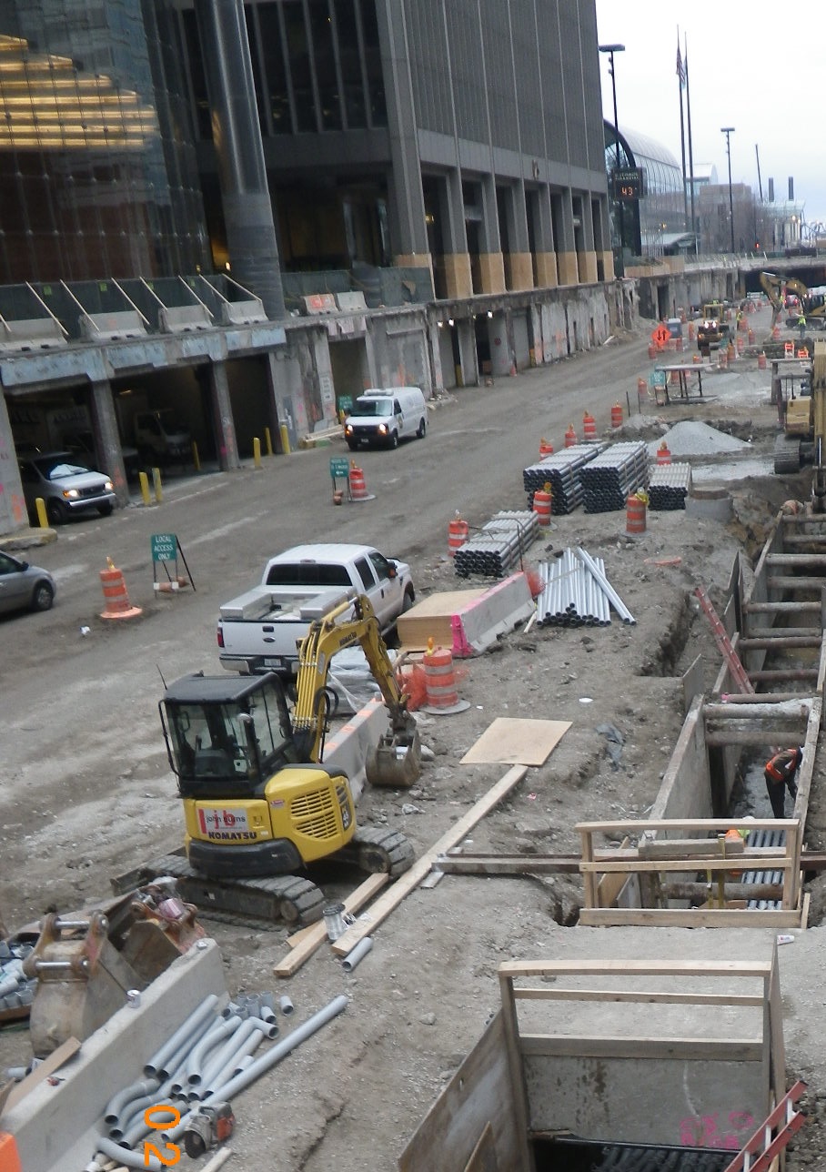 • Utilidor Construction: The Utilidor was the installation of a 32 cell concrete encased duct bank package running the entire length of the reconstructed Wacker Drive. The installation also included 6 cell concrete encased duct bank laterals running from the mainline near the utility entrances of various buildings. At some locations the utilidor was up to 20’ below the proposed Lower Wacker Drive Pavement. In addition to the duct bank packages JBCC was responsible for the installation of specially constructed precast manholes weighing approximately 30,000 lbs each. These larger manholes were used as tie in points for the laterals which terminated near the buildings at precast manhole weighing approximately 18,000 lbs each. JBCC was responsible for all shoring required making the excavation safe for the installation of the duct bank, and meeting the stringent requirements of OSHA. JBCC also had to be diligent in our digging techniques as to not hit the numerous utilities that were crossing all over Lower Wacker Drive. Due to all of these utilities JBCC had to utilize three different types of shoring methods during construction, and they were trench boxes, steel plates with hydraulic speed shores, and timber lagging.