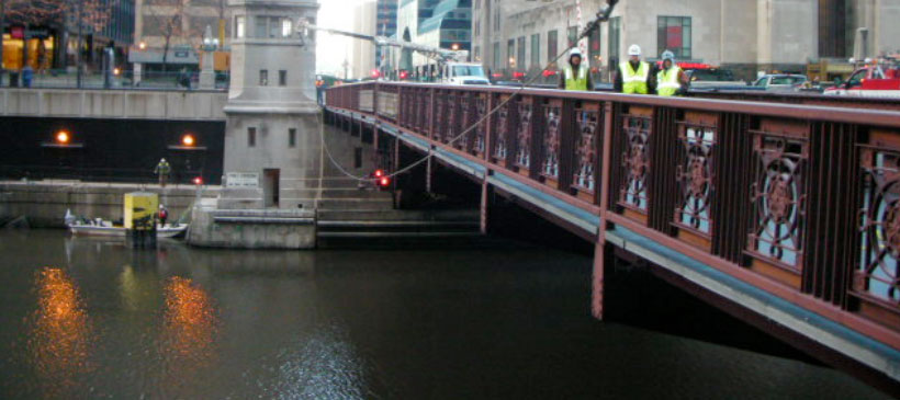 • Submarine Cable Installation: In order for the new bridge rooms to be able to be operable from one side, JBCC was required to install up to 6 submarine cables at one bridge location. Working with the coast guard and the city of Chicago, JBCC was able to install new submarine cables at Jackson, Adams, Washington, and Madison bridges. In order to complete this JBCC set up two 1A trucks at the east and west sides and essentially pulled the cable from one end to the other, then lowering the cable into the river. Using divers JBCC inspected the condition of the cable to ensure they were lying flat and not overlapping each other.