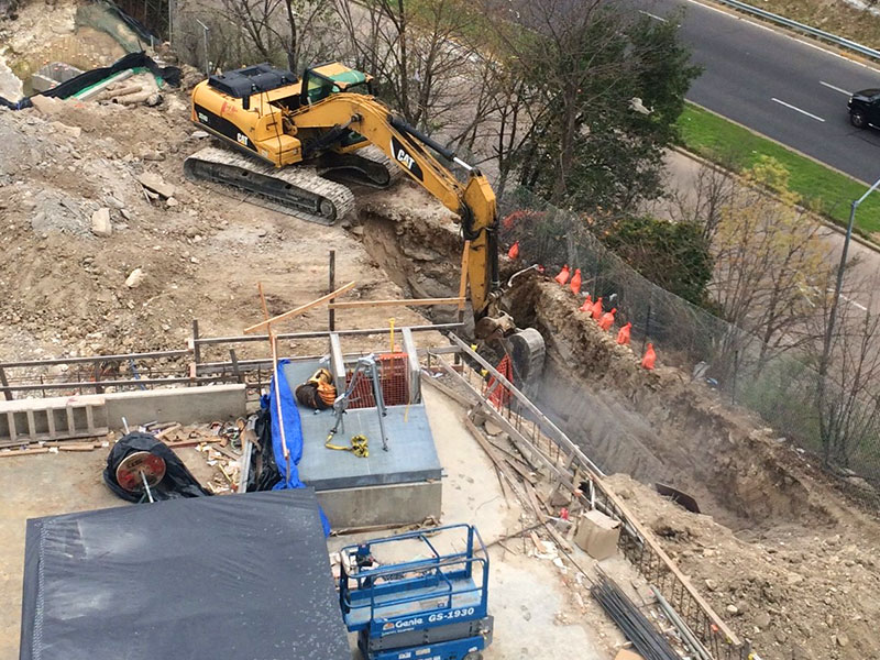 - The south side of the project had one-way access between the proposed building and an existing vertical face that lead to an existing roadway below.
